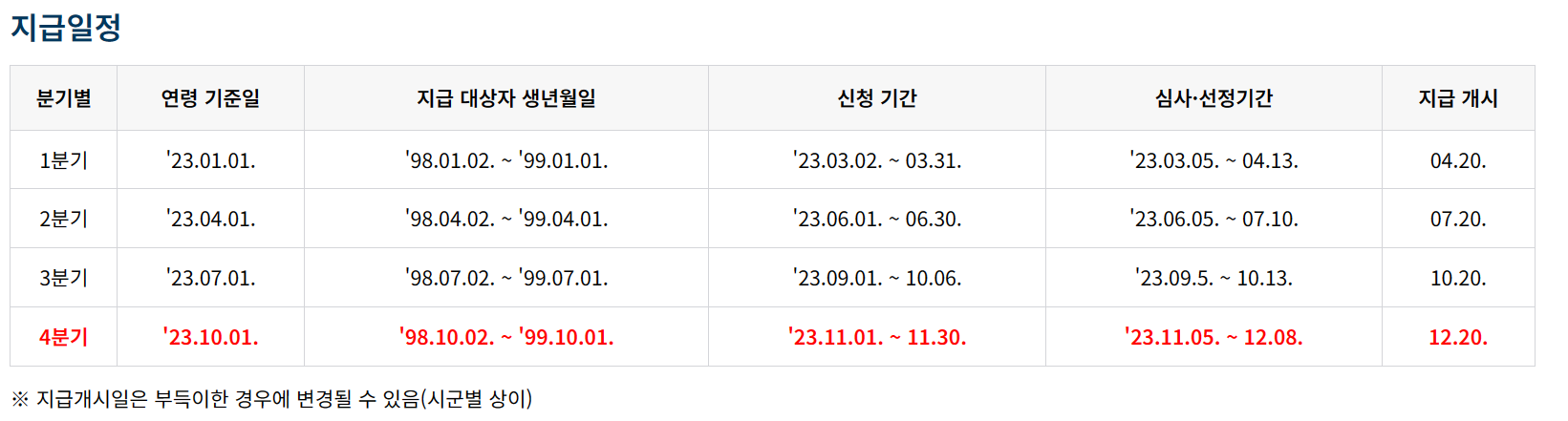 신청서 작성 시 몇 분기 부터 지급 대상자인지 꼭 확인이 필요합니다. 1~3분기 내 지급받지 못한 분기가 있다면 해당 분기를 함께 체크하여 소급하여 지원 받을 수 있기 때문입니다. 아래 표를 참고하셔서 대상자에 해당되나 신청이 누락된 분기가 있는 지 확인하시어 함께 체크하시길 바랍니다.