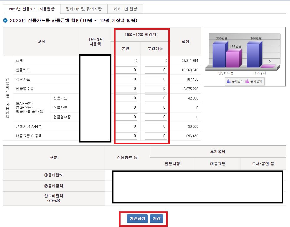 1~9월 부분은 자동으로 채워지니 10~12월 예상액 부분을 채워넣고 계산하기, 저장 버튼을 차례로 클릭합니다.