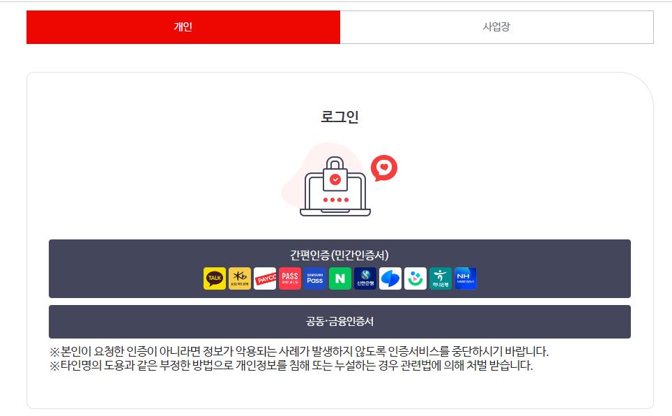 Step2. 아래와 같은 화면이 나오면 간편인증 또는 공동금융인증서로 로그인해줍니다