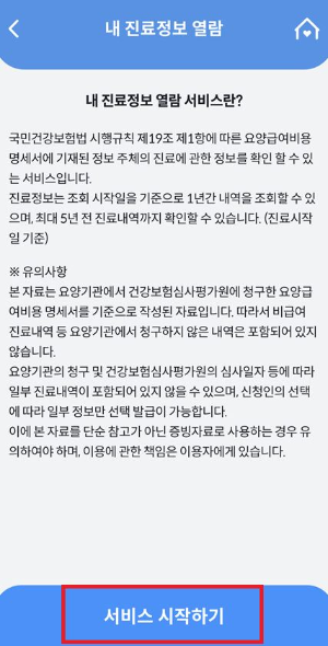 내 진료 정보 열람 -> 주민등록번호 입력→로그인→본인 인증→내 진료 정보 열람 화면의 서비스 시작하기 버튼 클릭