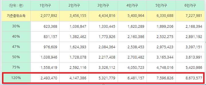 2) 소득 기준: 기준 중위소득 120% 이하인 자