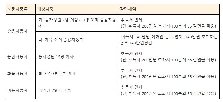 면제: 7~10인 이하 승용 자동차, 15인승 이하의 승합 자동차, 1톤 이하의 화물자동차, 배기량 250cc 이하의 이륜 자동차의 경우 면제 됩니다. 면제 금액의 max는 200만원으로 초과 되는 금액은 85% 감면율이 적용 됩니다.