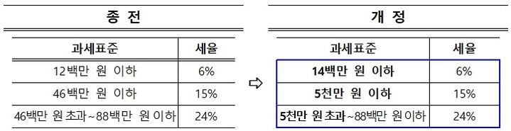소득세를 산정할 때 사용되는 기준액인 소득세 과세표준이 상향 조정됩니다. 이는 서민과 중산층의 세금 부담을 덜어주려는 취지로 만들어졌으며 이에 따라 하위 2개의 과세표준 구간이 상향되었습니다.