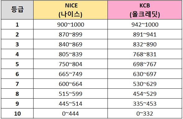 금융기간에 따라 개인의 신용점수 책정 시 NICE 점수를 택하는 곳이 있고 KCB 점수를 사용하는 곳, 혹은 둘 다 사용하는 곳이 있습니다. 둘 다 사용하는 곳은 둘 중 낮은 점수로 등급을 계산한다고 하니 이 부분 참고하시면 좋겠습니다.