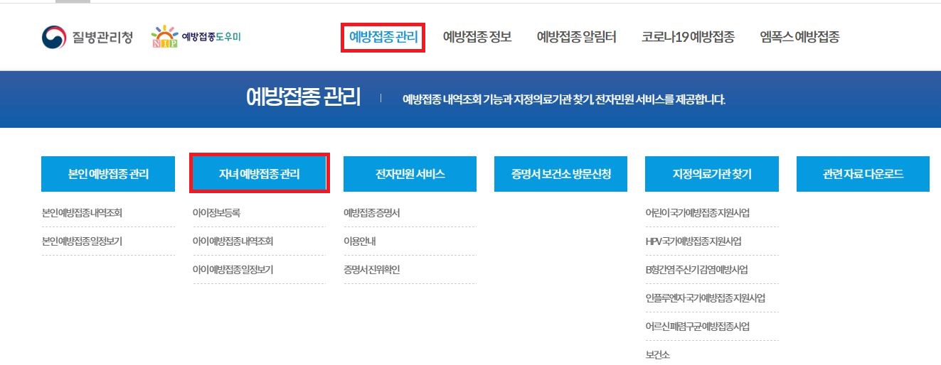 메인화면 -> 상단의 예방접종관리 클릭-> 자녀 예방접종 관리 클릭