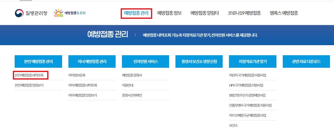 메인화면 -> 상단의 예방접종관리 클릭-> 본인예방접종 관리 항목의 본인예방 내역조회 클릭