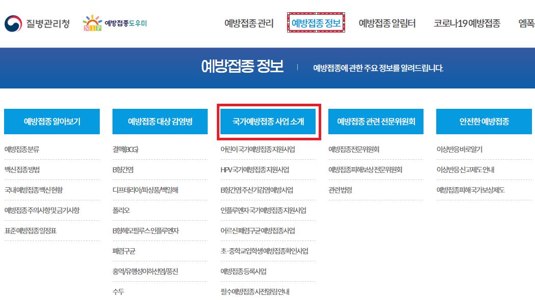메인화면 -> 상단의 예방접종 정보 클릭-> 국가예방접종 사업 소개