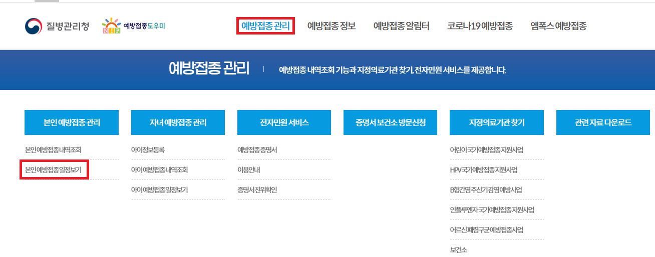 메인화면 -> 상단의 예방접종관리 클릭-> 본인예방접종 관리 항목의 본인예방 접종일정보기 클릭