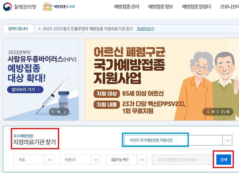 메인화면 -> 국가 예방접종 지정의료기관 찾기 항목란