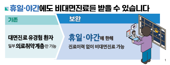 비대면 진료는 가까운 곳에 병원이 없는 지역에 사는 분들에게 매우 유용한 제도로서 그간 섬, 산간 벽지 등 의료 시설 접근이 어려운 의료 취약 지역에서는 평일 낮에도 비대면 진료를 받을 수 있도록 운영해 왔습니다.